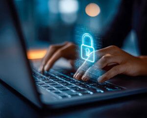 Person using a laptop with digital security lock icon overlay