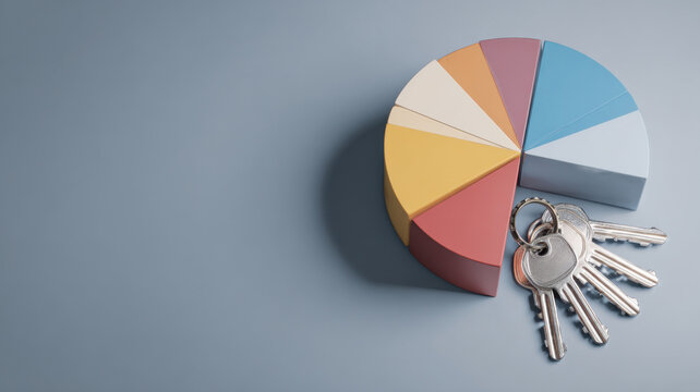 big pie chart Lock and many bar chart small keys, representing business security, protection, and confidentiality