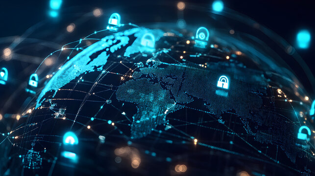 A digital world map with glowing blue locks and connecting lines representing secure global network