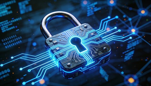 Abstract digital network security illustration with glowing lines and circuits representing data protection and connectivity