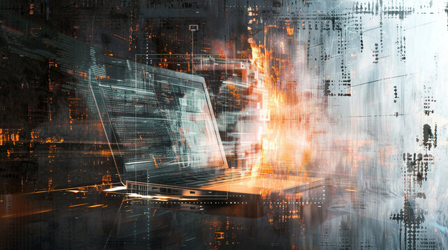 An abstract illustration of a laptop and lock fused together in an innovative and unique design with a backdrop of shimmering metallic textures