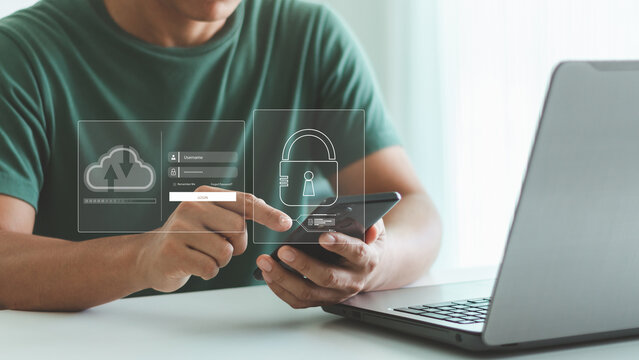 cybersecurity concept Global network security technology, business people protect personal information. Encryption with a padlock icon on the virtual interface.