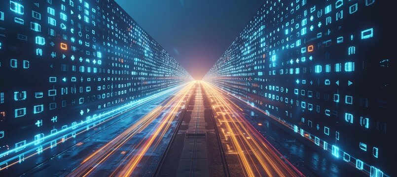 Futuristic data transfer abstract cyber background shows orange, blue glowing light streaks in technology concept. Ideal for science, big data, artificial intelligence, network, crypto, blockchain,