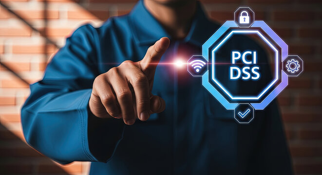 Person touches PCI DSS icon with technology elements on futuristic screen