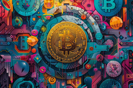 This detailed concept art bursts with vibrant colors and symbols representing Bitcoin and the diverse world of cryptocurrency..