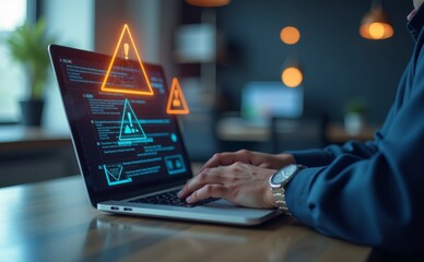 Person typing on a laptop with holographic warning symbols on screen in an office environment, concept of cybersecurity threat