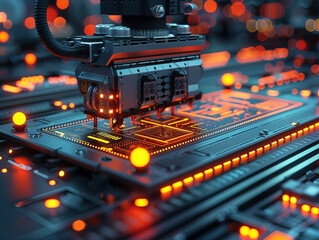 Close-up electronic circuit board. technology style concept. Contemporary Super Computer Processor. Industrial Robotic Manipulator End Effector Holding CPU Chip