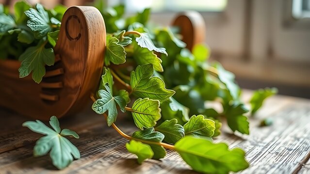 tolerable. Close-up of dried lovage leaves on a wooden rack with natural morning light. gardening catalogs, home-decor guides, designed for home decor and floral branding, used by sports marketers.