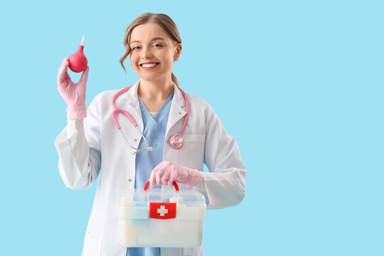 Medicine, healthcare, profession and people concept - A funny European woman doctor in a white coat with a stethoscope blows air on herself from an enema she holds in her hands outside
