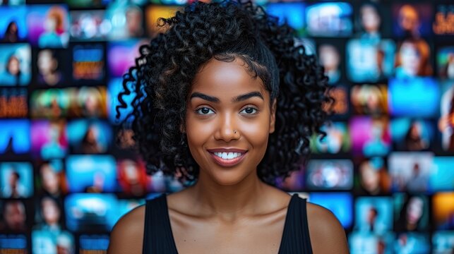 Smiling creator livestreaming from laptop with glasses, hoop earrings and monitor chat