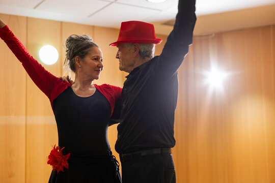 senior couple looking at each other posing for dance class in dance workshop for retirees