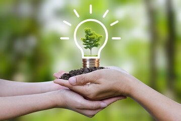Two people holding light bulb with tree on green background. Demonstrates energy savings and turns to solar and natural energy. Saving energy is helping both ourselves and the planet.
