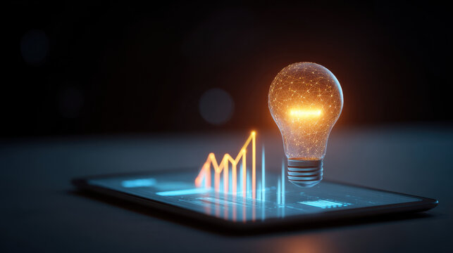 Innovative light bulb representing ideas and creativity above tablet displaying data analytics and graphs, symbolizing technology and progress in business