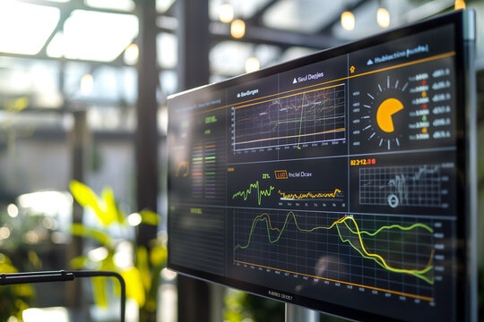 Closeup of a digital energy monitoring system displaying realtime consumption data on a screen with colorcoded graphs and figures indicating energy savings in manufacturing processes.