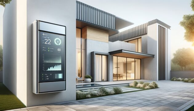 A sleek wall-mounted energy storage system with an integrated smart display showing real-time energy metrics, set against a modern home exterior.