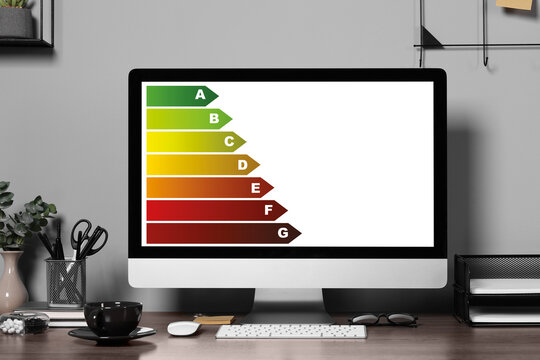Energy efficiency rating on display. Workplace with modern computer