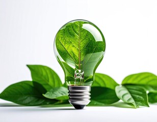 Green light bulb with fresh leaves symbolizing eco energy and sustainability.