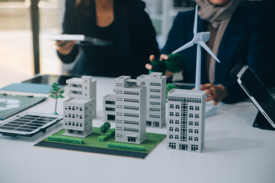 Corporate team researching sustainable alternatives for carbon reduction and clean energy growth