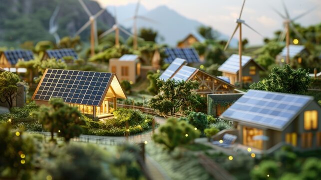 Sustainable Remote Village with Solar Panels and Wind Turbines for Renewable Energy Independence