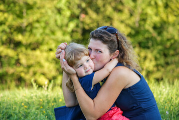 Two cows with horns. The one licks playfully, hugging and cuddling the other cow, in a green meadow.