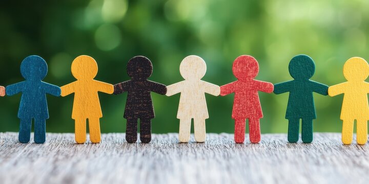 Colorful paper figures hold hands, symbolizing unity and diversity on a blurred natural background.