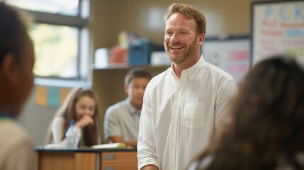 A male teacher warmly engages with elementary students in a colorful classroom, encouraging participation and fostering a positive learning atmosphere during a lesson focused on education