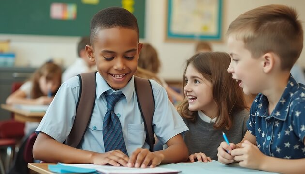 Cartoon-style classroom with young students engaged in an educational discussion UHD 4K Image