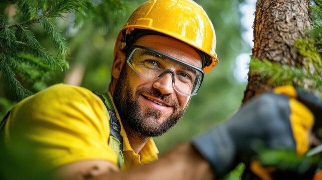 A gardener wearing a protective helmet is engaged in cutting a tree branch in a lush green forest, symbolizing the rigorous and precise work of tree maintenance.