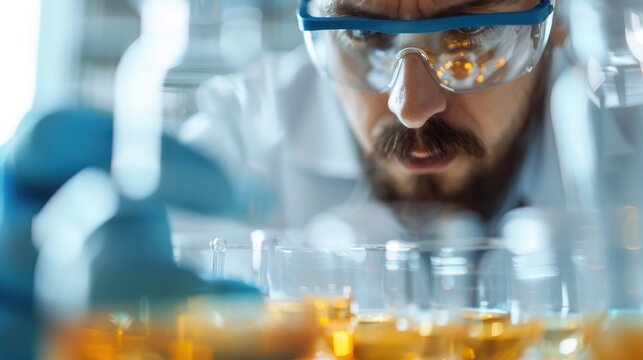 A scientist is deeply engaged in work in a modern laboratory, surrounded by test tubes and scientific equipment, representing dedication to research and scientific discovery.