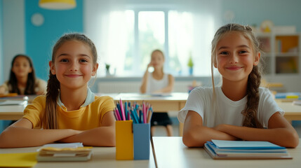 Two cheerful girls sit at desks in a bright classroom filled with engaged students