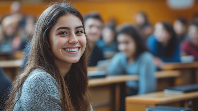 In a lively classroom, a joyful teacher beams with pride as she poses among engaged students. The atmosphere radiates positivity and enthusiasm for learning, fostering a sense of community