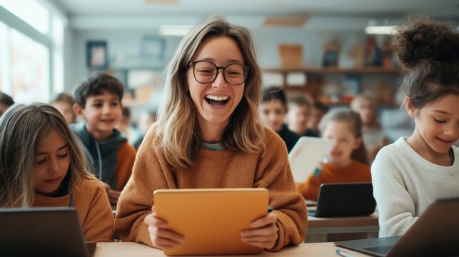 Cheerful teacher and young students using digital tablets and laptops in a classroom, engaging in interactive learning activities with a focus on educational technology.