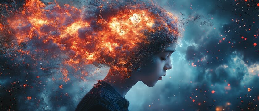 Overwhelming information data explode out of head of young human brain, too much media, too much information, maximalism, news, social media addiction  image weber