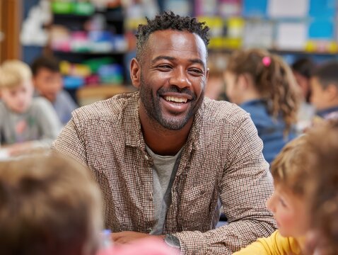 Enthusiastic male teacher engaging with students in a vibrant classroom setting.