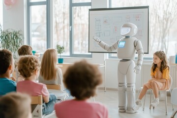 Educational robot engages students with interactive presentation in a bright classroom setting