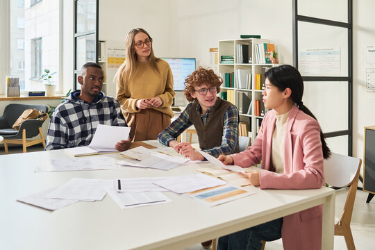 Group of diverse individuals engaged in studying foreign languages in modern classroom environment, reviewing documents and interacting with each other while seated around table