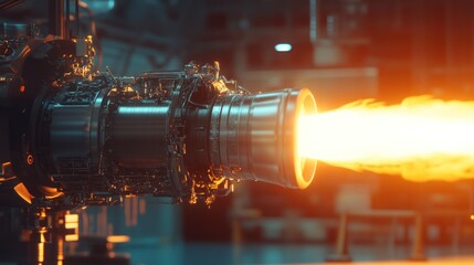 Jet engine test inside industrial facility. Powerful flame exhaust emitted during engine functionality check. Aircraft or rocket tech development and engineering. Flame exhaust testing inside factory.