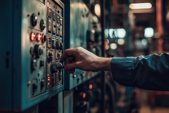 Industrial Operator Adjusting Control Panel in Manufacturing Facility with Buttons, Switches, and Lights Highlighting Machinery Operations