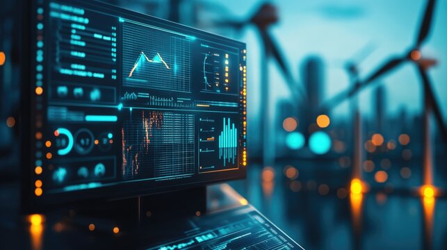 Wind turbine farm with digital analytics tools showcasing data trends and insights, highlighting renewable energy impact on sustainability and efficiency