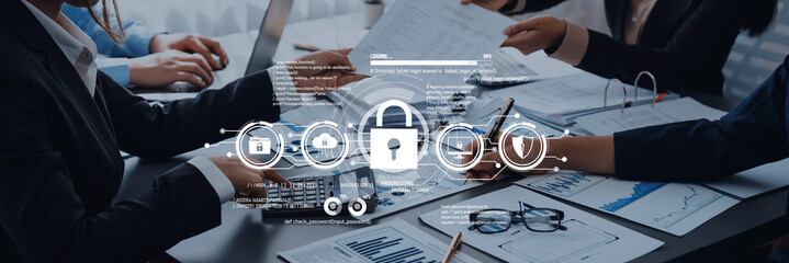 Business professionals discussing security strategies and protection measures while analyzing financial documents in a modern office environment Trope.