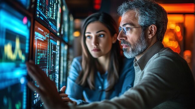 professionals in cybersecurity analyzing data on monitors in a dimly lit server room concentrating on digital protection encryption methods and network security against cyber threats
