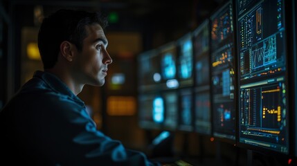 In a dimly lit server room, a technician focuses on multiple screens showing network activity and security alerts, ensuring system integrity and security
