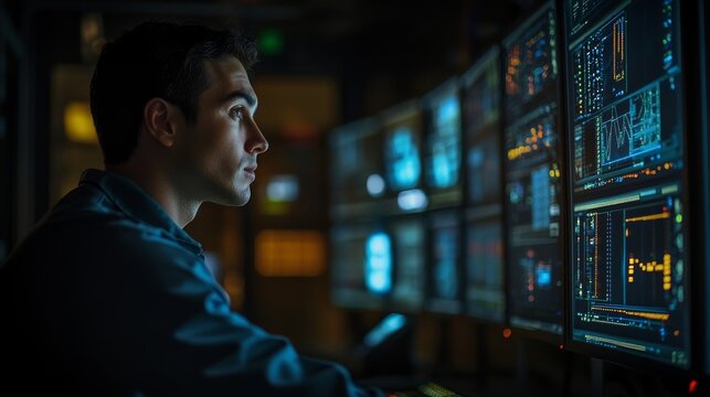 A focused man works late into the night analyzing complex data on multiple computer screens in a dimly lit office