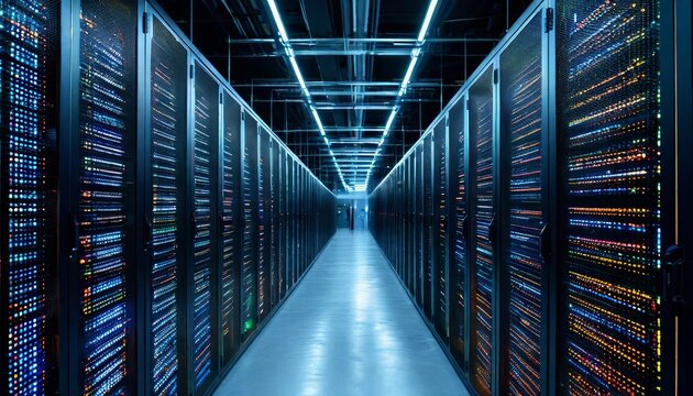 High tech server room displaying glowing network infrastructure. Rows of computing equipment processing digital data. Illuminating long corridor with blue tinted technological ambiance