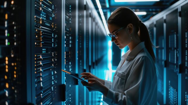 A woman is seen using a tablet in a server room. This image can be used to illustrate technology, connectivity, or data management concepts