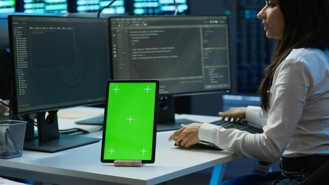 Software developer in data center monitoring security threats using mockup tablet. IT professional using green screen device, ensuring compliance with server room regulations, camera A