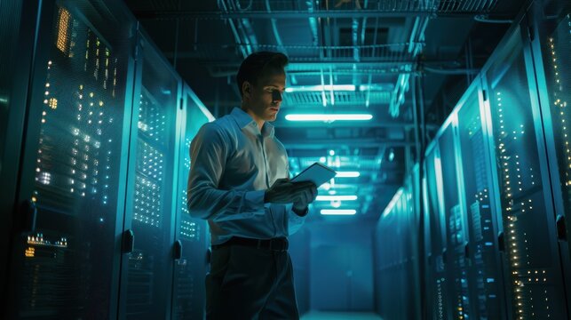 Professional Business Person Reviewing Data on Tablet in Server Room Environment