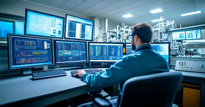 Industrial operator monitoring multiple screens with data analysis in a control room environment. High-tech automation and process control concept for industrial management and engineering design
