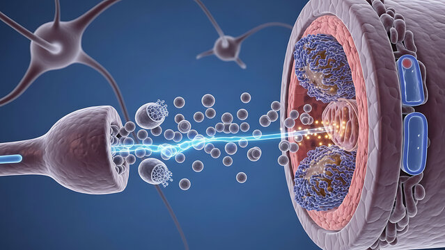 Detailed Neurotransmitter Release at Synapse with Vesicles and Receptor Sites Medical Visualization
