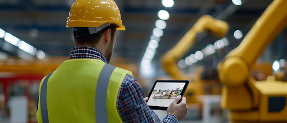 Engineer analyzing safety data on tablet in construction site environment focusing on project insights